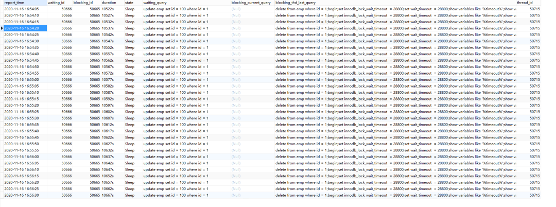 的方法定时在 MySQl 内执行,将行锁等待信息记录到日志表中,并且加入了 pfs 表中的事务上下文信息,这样可以省去登陆服务器执行脚本与分析 general_log 的过程,更加便捷。