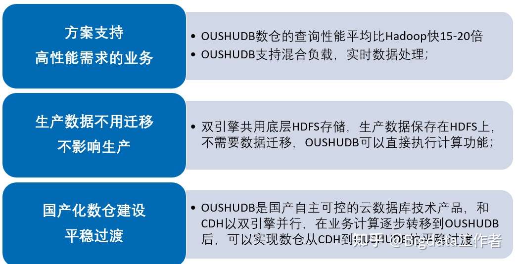 | 过去几年,大多数企业选择了Hadoop技术(大多数选择CDH)建设大数据平台,但是由于Hadoop的分析性能相比MPP差距很大,OUSHUDB融合了MPP和Hadoop的技术,采用存储与计算分离的架构,是一个很好的补充CDH平台分析性能不足的解决方案。本文对CDH和OUSHUDB的双引擎数仓平台方案进行分析介绍。 CDH平台遇到了三大挑战 1. 技术选型的挑战 目前多数客户在建设大数据平台的产品采购或者现有集群扩容时,要求基于国产自主可控的要求; 2. 平台技术局限性的挑战 u 数据处理性能可以满足大多数业务需求,对于性能要求高的业务需求无法满足; u 单个集群处理数据能力有限,需要建立多个集群,且集群间无法共享数据,维护工作量巨大 u 实时性要求越来越高 3. 升级和维护成本高 在Hadoop两大厂商合并以后推出了CDP的升级产品,但是原来基于CDH的所有应用面临重新开发,所以升级成为鸡肋;如果不升级,无法采用hadoop新功能,如果升级,则使应用开发商再次投入开发成本; 基于上述挑战,如何在保持现有CDH投资的基础上,满足业务部门高性能业务的需求? 在CDH平台基础上,引入OUSHUDB数仓产品,可以很好的解决这个问题。 OUSHUDB介绍 OUSHUDB是偶数科技从2016年开始推出,至今已经发展到4.0版本的分析型数仓解决方案。OUSHUDB不仅具备了MPP强大的计算能力,也支持HDFS的扩展能力,如果你的场景解决分布式查询问题,有实时性要求,OUSHUDB也可以符合期望;OUSHUDB主要有下列技术特点: |