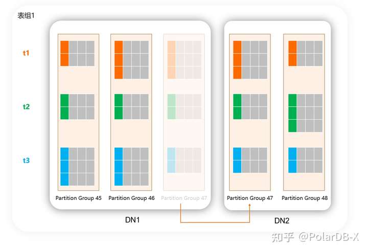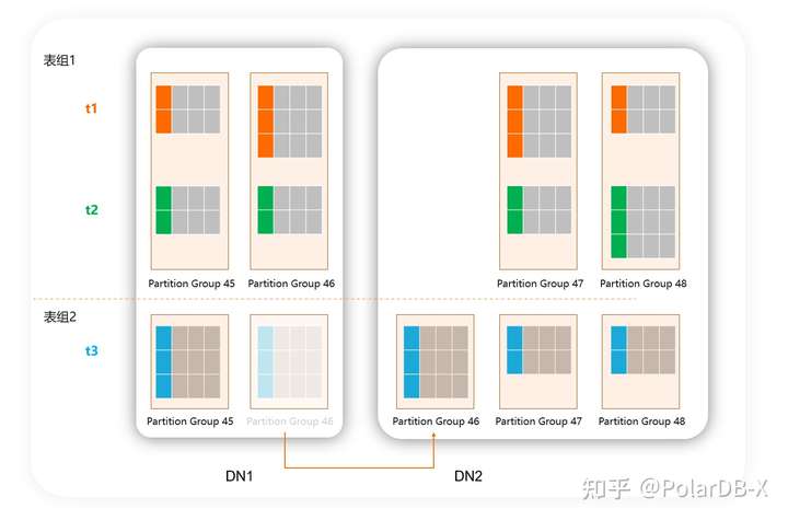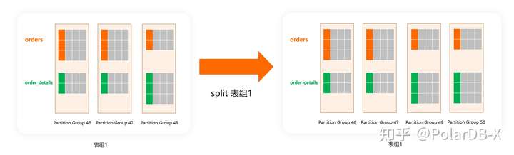 这里有一个很关键的点,这种调整会只需要修改元数据,并不需要搬迁数据,代价极低。因为将一个表挪到一个新的表组,并不需要理解改变它的数据分布。