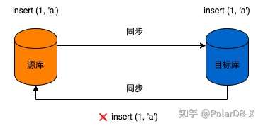 针对问题 1,PolarDB-X 的全局 Binlog 可以使我们轻松复用 MySQL binlog 同步的全套逻辑进行数据回流同步。针对问题 2,先简要说明一下什么是数据回环。如图 5 所示,假设表结构为 id, name,其中 id 为主键。如果 insert 了一行数据 (1, 'a'),这一行数据会被同步到目标库中进而产生 binlog,而目标库的回流链路如果无法识别这条数据的来源,会重新将产生的 binlog 事件同步回源库。如果只是简单的 insert 操作,回流时就会出现主键冲突。如果使用了 upsert 或者 replace 操作,就会出现死循环的情况。