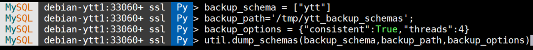 # 备份指定的数据库backup_schema = ["ytt"]# 备份路径backup_path='/tmp/ytt_backup_schemas';# 备份选项backup_options = {"consistent":True,"threads":4}