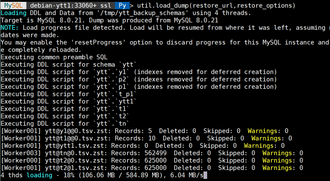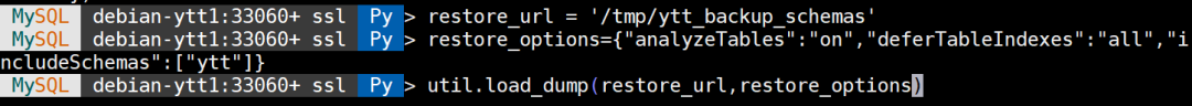 # 删除原数据库mysql> drop database ytt;Query OK, 8 rows affected (0.27 sec)# 创建指定数据库ytt.mysql> create database ytt;Query OK, 1 row affected (0.01 sec)# 用于恢复的备份集目录restore_url = '/tmp/ytt_backup_schemas'# 恢复选项:是否对恢复的表做样例数据收集,是否延迟建立索引,恢复指定的数据库等。restore_options={"analyzeTables":"on","deferTableIndexes":"all","includeSchemas":["ytt"]}