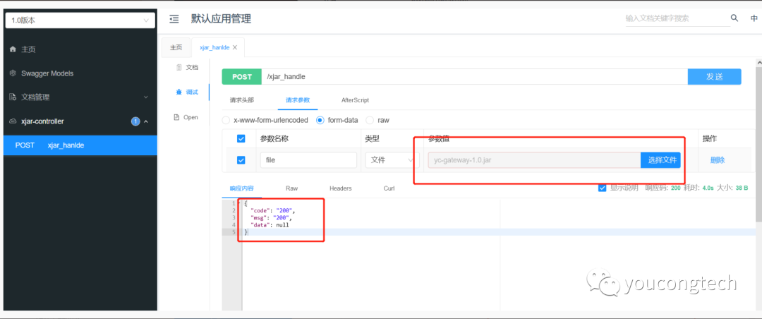 @RestControllerpublic class XjarController {private String fileStorePath="D://test/jar_backup//";private String outEncrypPath="D://test//jar_encryp//";@PostMapping("/xjar_handle")public RespBody xjar_hanlde(@RequestParam("file") MultipartFile[] files) {try {if (files.length > 0) {for (int i = 0; i < files.length; i++) {saveFile(fileStorePath, files[i]);}}} catch (Exception e) {e.printStackTrace();}return RespBody.success();}private void saveFile(String filePath, MultipartFile file) {try {//原文件名String originalFileName = file.getOriginalFilename();//获取文件扩展名String extName = file.getOriginalFilename().substring(file.getOriginalFilename().lastIndexOf("."));//重新定义文件名String fileName = originalFileName + extName;// 显示文件容量String fileSize = String.valueOf(new BigDecimal(file.getSize()).divide(new BigDecimal("1024"), 0, BigDecimal.ROUND_HALF_UP));File temp = new File(filePath);if (!temp.exists()) {temp.mkdirs();}if (fileSize.length() > 0) {File localFile = new File(filePath + fileName);//把上传的文件保存至本地file.transferTo(localFile);//本地加密XCryptos.encryption().from(localFile).use("io.xjar").include("/io/xjar/**/*.class").include("/mapper/**/*Mapper.xml").include("/*.yml").exclude("/static/**/*").exclude("/conf/*").to(outEncrypPath+"encrypt_"+originalFileName+".jar");}} catch (Exception e) {e.printStackTrace();}}}