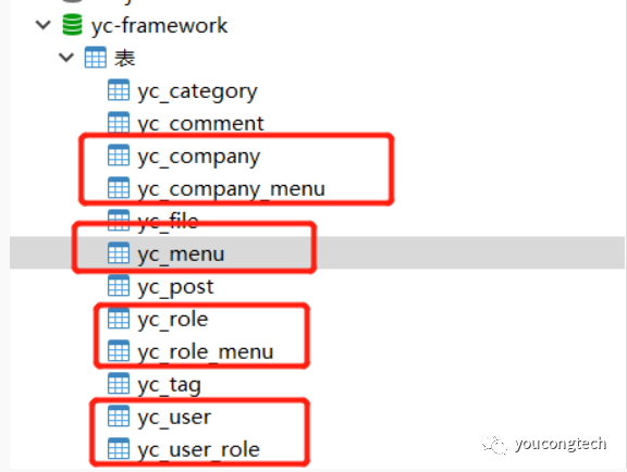 YC-Framework主要基于RBAC模型,涉及相关表如下图所示: