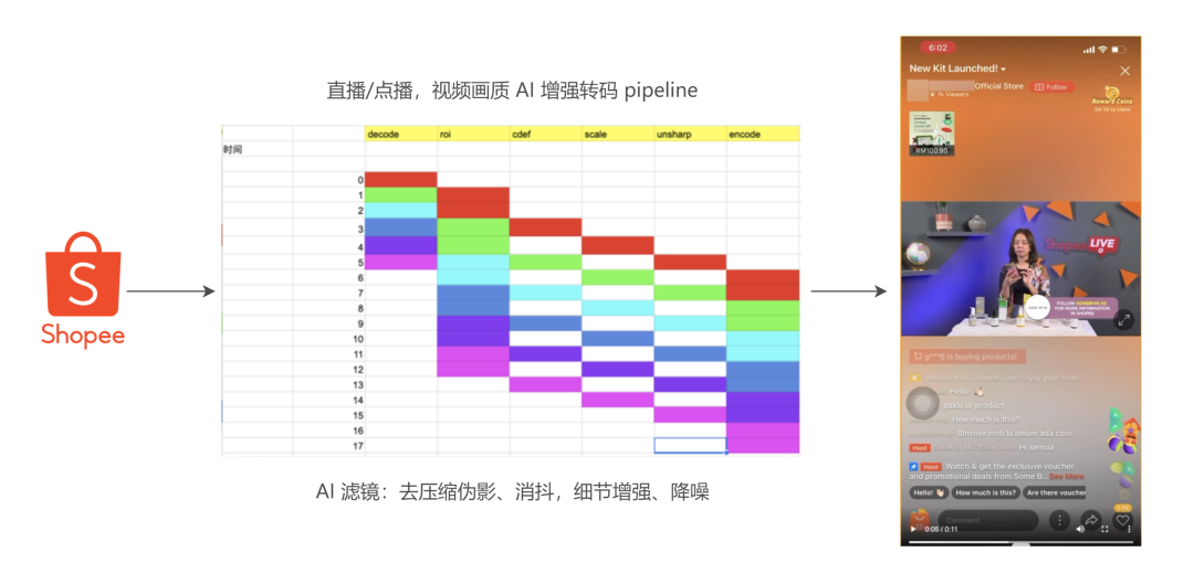 首先是 Shopee App 的转码服务,涉及点播和直播转码两个转码平台。有一些 AI 增强类的前置处理,一帧耗时比较长,对于点播业务来说,这不是什么问题,只是转码耗时增长。而对于直播业务来说,就需要考虑效率问题了,比如帧率 30,最多一帧只能耗时 33ms,如果串行进行所有前置处理,就会使得出帧帧率小于输入帧率,导致视频帧堆积的问题。
