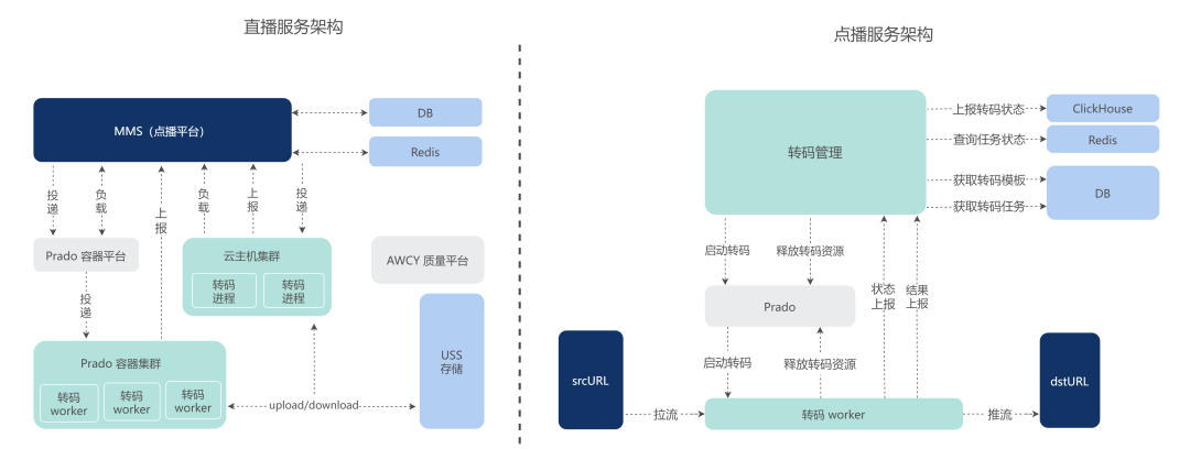 上图为 Shopee 的直播/点播转码服务架构图。点播转码集群分为内部 Prado 容器集群和云主机集群,MMS 点播平台是我们的上游服务,该平台可以根据负载自由调度,选择使用 Prado 转码或是云主机转码。