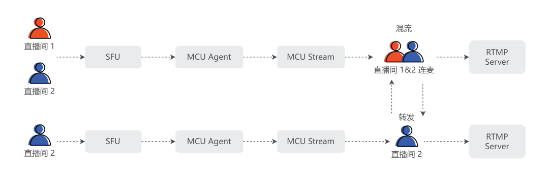 这里值得注意的是,通常云厂商为了后台的稳定性,将连麦服务的逻辑简单化了,不管房间是否有连麦主播,都采用转码的方式处理视频流。而既然有转码,就涉及到视频编码环节,若只有一路主播的时候也转码,会浪费大量算力资源。