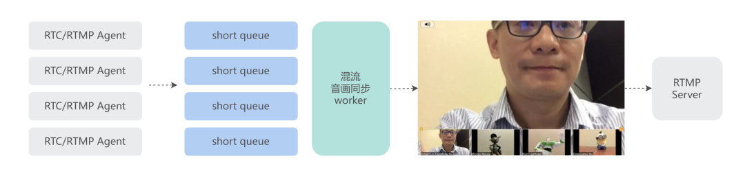 对于 Shopee 内部通讯软件 SeaTalk,我们提供了多人会议混流服务作为技术能力储备(目前该功能还未上线),混流模块中嵌入了开源软件 OWT 和 mediasoupclient 的核心模块,并且在 OWT 模块上增加了 3 帧的缓存队列,以平滑混流视频帧。会议混流系统支持 RTMP 和 WebRTC 接入。
