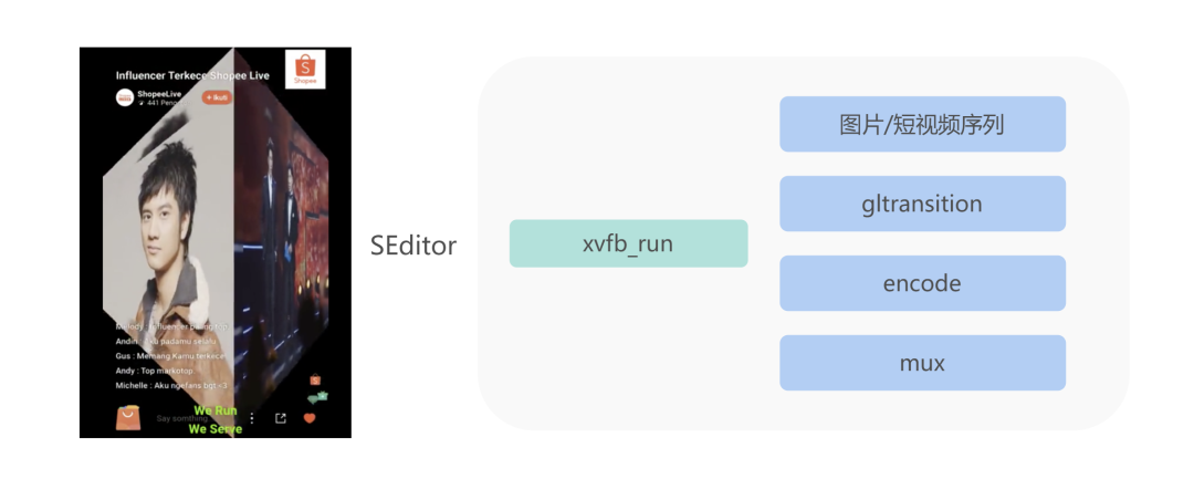 针对 Shopee 的短视频产品 Shopee Video,我们开发了一套后台编辑服务,用于完成一些 2D 特效,例如图片序列转视频、添加背景音乐、画面切割、文字动画、视频转场、背景模糊等。目前通过 CPU 执行 Xvfb 虚拟显存的方式完成 gltransition 的转场效果。