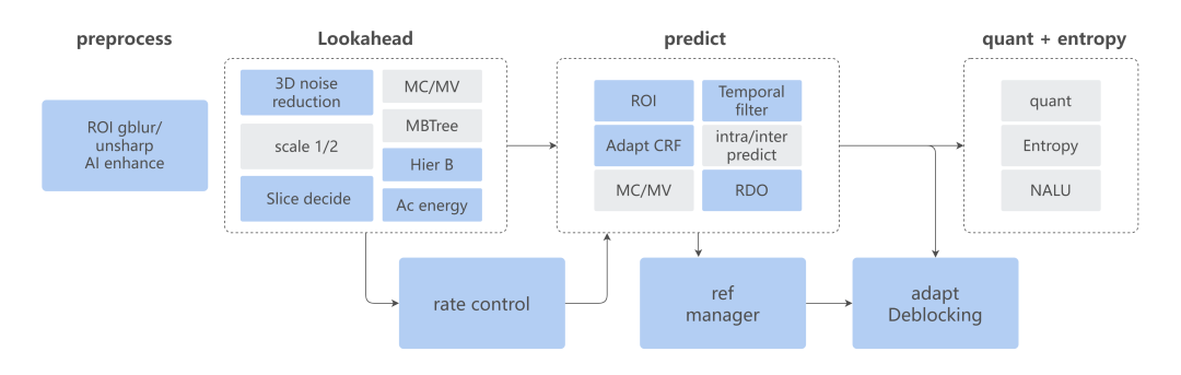 第一步解码得到 YUV 画面数据; 然后经过前置处理,包含了 ROI 背景 gblur 滤波、锐化、AI 增强; 接着将 YUV 数据送进编码器,进入预编码环节,主要步骤是下采样、Scenecut 关键帧判断,帧类型决策、AC 能量值计算、MBTree 等; 下一步进入编码环节,包括帧内/帧间预测编码、RDO、Deblocking、参考帧管理等步骤; 最后就是进入量化和熵编码环节,最终输出 NALU 单元。