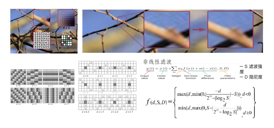 CDEF 大致可以理解为首先计算当前 8x8 的块在预设的八个方向块上的残差,选择残差最小的作为确定的角度方向,然后找到对应的角度方向矩阵进行滤波。图中最右边是滤波后的效果,可以看到树枝的边缘更加平滑了。