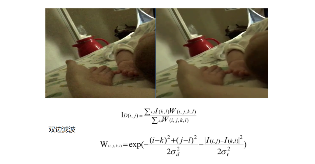 我们在编码器内置的 3D 降噪算法通过复用运动向量的方法规避了效果差和速度慢的缺点。利用前后帧的预测信息,在预编码中得到的运动向量作为依据,找到被参考帧对应的块,作为滤波的参考块,然后通过双边滤波算法,对当前块进行滤波。