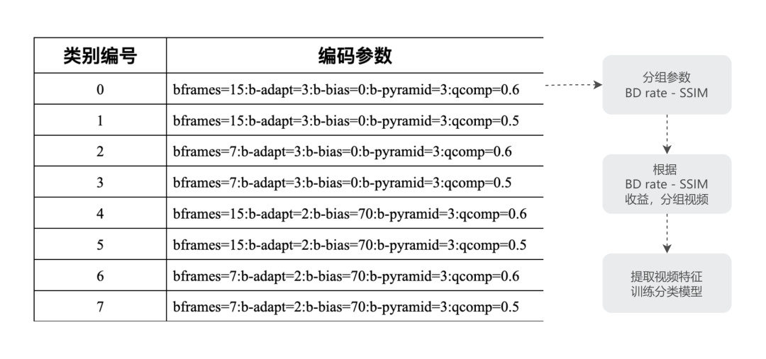 首先将这些参数分成性价比最高的八组(当然这八组是通过我们线上的视频跑出来的结论),然后分别得出图中几组参数的最佳 SSIM BD-rate 收益——这里的收益是相对于我们线上统一的编码参数而言,把最佳 BD-rate 视频,相同参数的作为一组,然后针对这一组视频提取特征,进行训练,使用训练完的模型对线上视频进行分类。