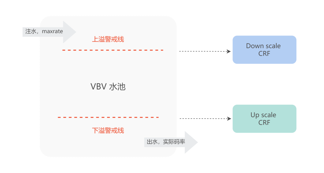 在编码器码控方面,我们也做出了一些优化。如图,这是 VBV + CRF 码控模型示意图,一边注水,注水速度为 maxrate*帧duration