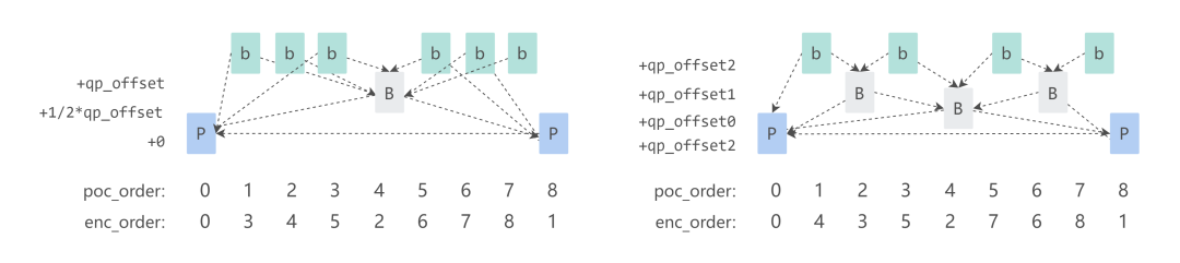 如图所示,左边是社区版本 x264 编码出来的 B 帧结构,右边是优化后的 B 帧结构。由于右边的 B 帧分了更多层,从图上可以很直观地看出来,参考帧和被参考帧的距离更近,参考关系更优。
