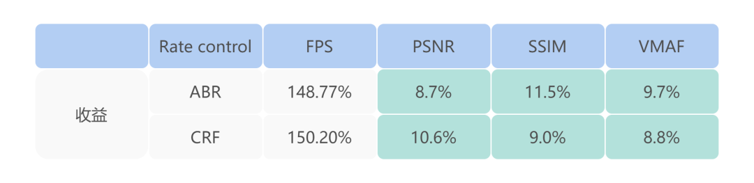 另外,分层 B 帧使用先确定 miniGOP,然后二分的方式决策参考关系和层次,相较于社区版的 Adapt B 和 Viterbi B 帧决策,速度更快。以下是我们测试的 BD-rate 提升和帧率提升收益。