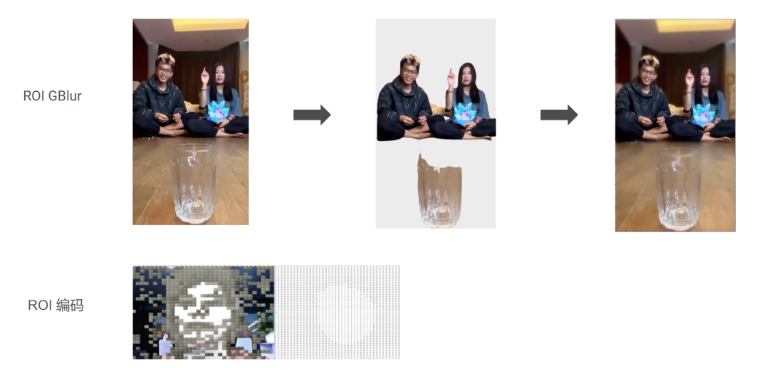 如图所示,左边是原图,中间是扣下来的 ROI 区域,右图是高斯模糊之后 ROI 编码的效果。