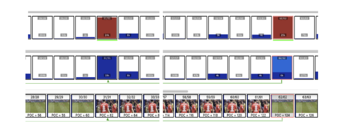 在剪辑视频的时候,可能会出现一段节目中间要植入广告的场景,如果按照原生的 x264 帧类型决策策略,会发生 scenecut,决策为 IDR 帧,然而我们可以看到,这里中间植入的广告的前后画面很有关联性。