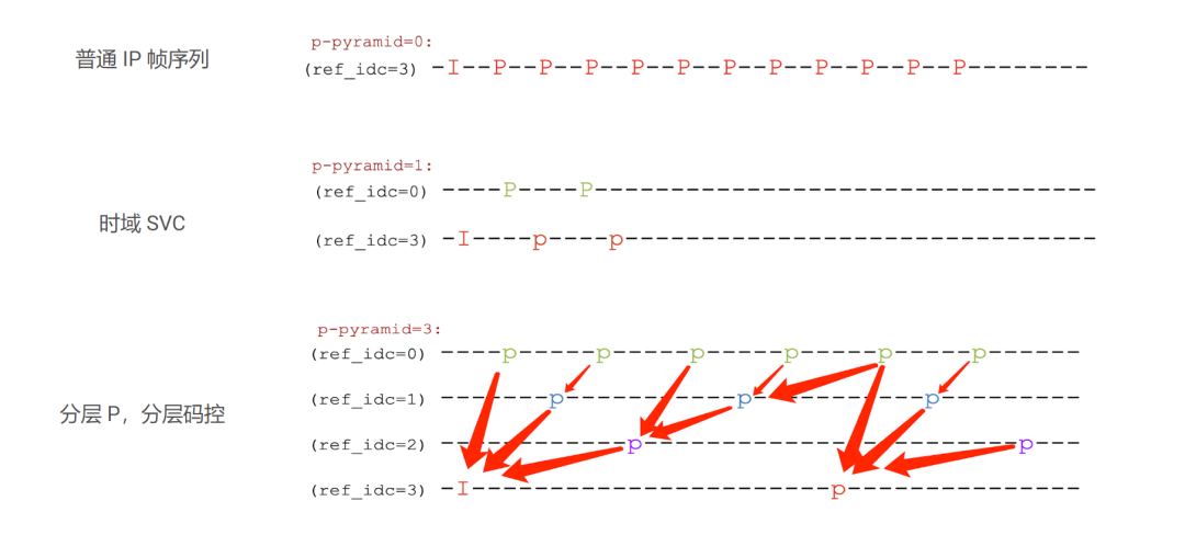 这样一来,我们在传输过程中可以任意丢弃上一层的 P 帧,而不影响解码播放。下行带宽不足的时候, 在一个 miniGOP 内部,上层的 P 帧可以根据实际网络情况丢弃,以降低带宽,从而保证视频的流畅性。