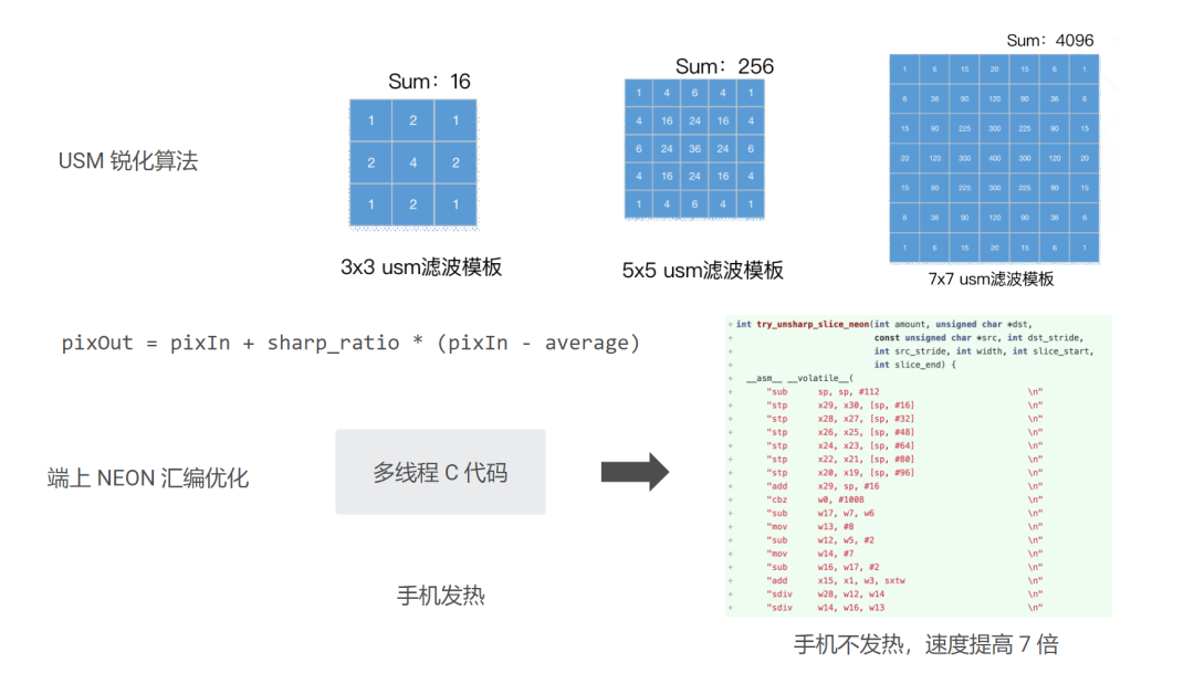 于是我们针对 3x3 的 USM 模版,用 NEON 汇编指令优化了锐化函数,把一些点积、累加运算通过 SIMD 指令并行处理,锐化处理的帧率提高了 7 倍,手机也不再发热。
