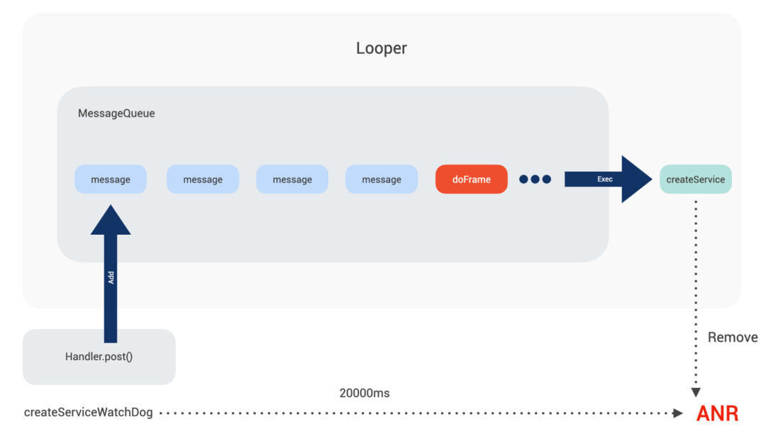 对于 ANR 来说,其原理是类似的。我们拿系统创建 Service 举例,在目标 Service 创建过程中会调用到 realStartServiceLocked()