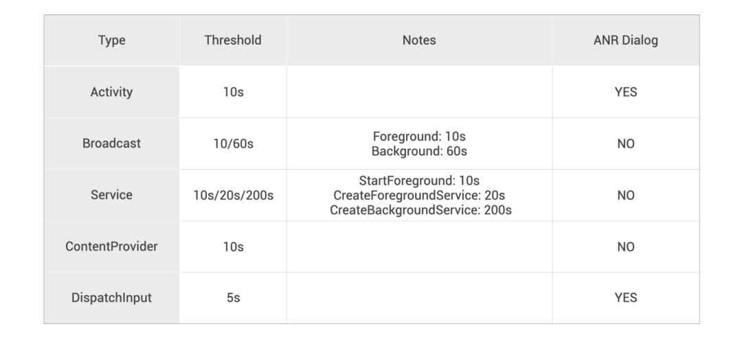 系统对不同的事件,其“容忍度” 和 ANR 信息引爆后的表现也有所不同,具体定义见表: