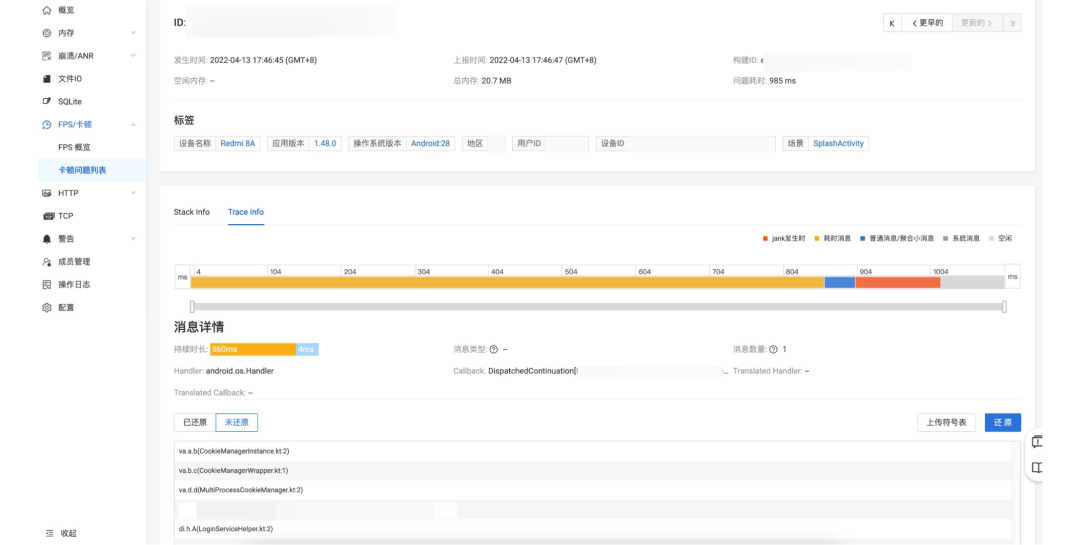 此时,需要进一步借助 Looper 监控看板工具查看本次 ANR 上报的 Looper 数据。