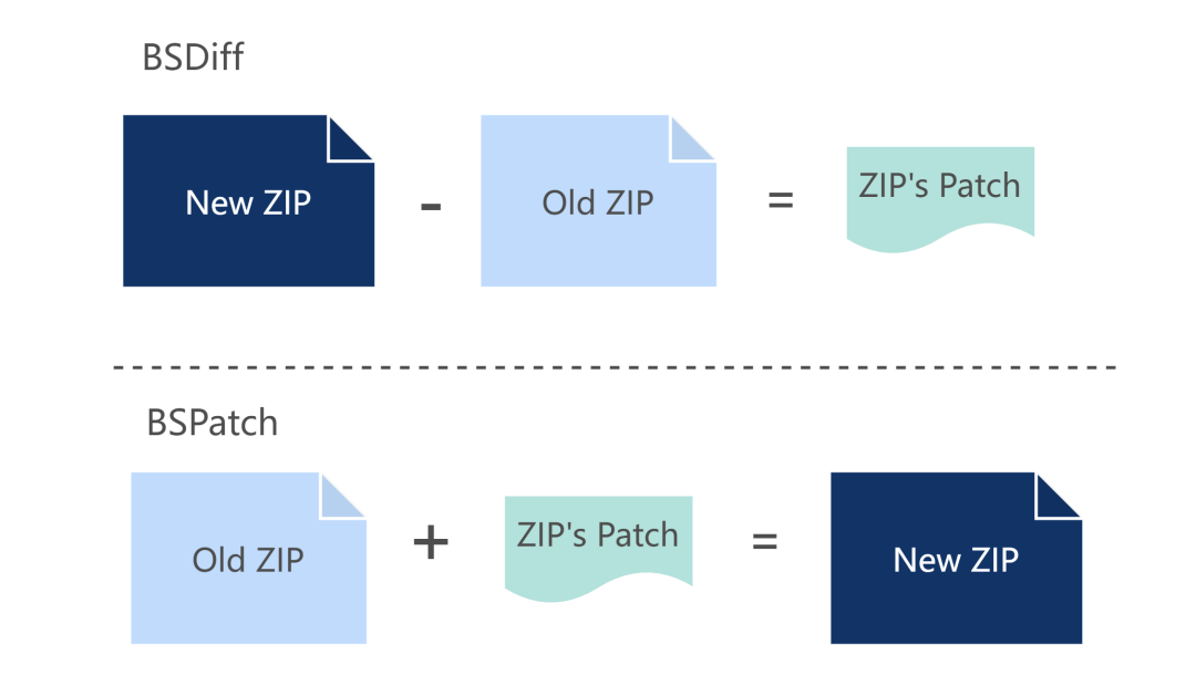BSDiff 算法开源且免费,用 C 语言写成,源代码可以在服务端、Android/iOS 端执行。BSDiff 算法所搭配的打补丁算法 BSPatch 可以将旧文件和 Patch 结合,恢复出新文件。BSDiff 和 BSPatch 算法并称 Bsdp 算法。