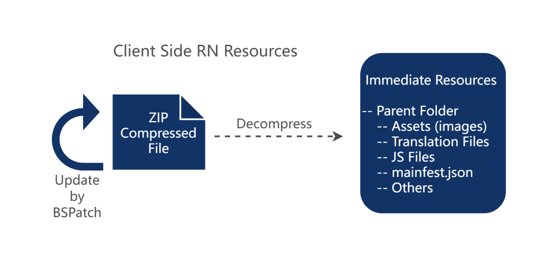 具体说来,RN 打包的直接产物包含了一定目录结构的 JS 代码、翻译 JSON、图片、配置文件。所有这些文件压缩为一个 ZIP 压缩包。在 App 初始安装时,里面有这个 ZIP 包,以及其解压的 RN 资源。