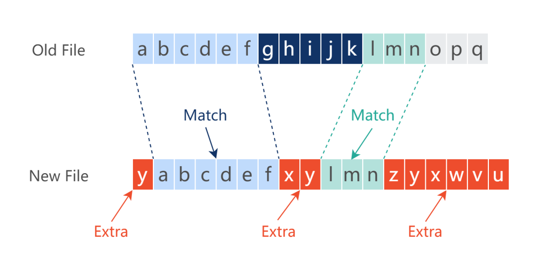 对于新文件的内容,它尝试从旧文件找到匹配的最长公共子序列,并记录了新文件的内容相对于旧文件的位置变化,站在新文件面向旧文件的视角,尽可能地用旧文件的内容拼装成新文件。