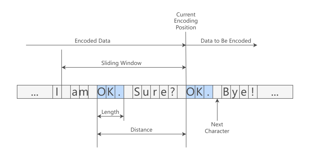 在上图中,当编码来到 “OK.”(右侧,蓝色标记)时,在滑动窗口回溯发现有重复的 “OK.”(左侧,蓝色标记)。LZ 算法记录下左侧 “OK.” 相对于当前位置的距离(Distance)和长度(Length),然后再推进到下一个字符(Next Character)。在压缩的结果文件中,此处就会保留一个“OK.”,然后用 Distance+Length 的方式把 Sliding Window 里重复的 “OK.” 表示出来。这样就避免了 “OK.” 重复出现,节约了体积。若重复字符若更长,压缩效果会更明显。
