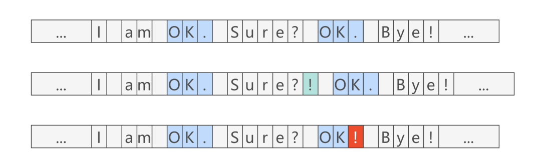 考虑上图第三行的情况,若插入了 “!”(橙色标记),则原有的 “OK.” 重复字符(Literal)不复存在,编码产生了巨大的改动。