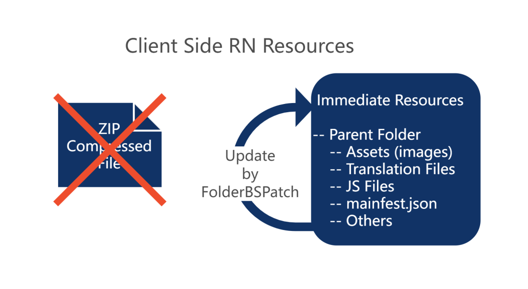 考虑到各个资源文件分散传输(2.1 与 2.2)的缺点,改进方式是在编译时把 RN 各直接资源文件放在一个文件夹里,然后用 ZIP 工具压缩为一个文件,采用 ZIP 压缩资源全量包以及压缩资源的 Patch 来实现初始安装和后续更新。