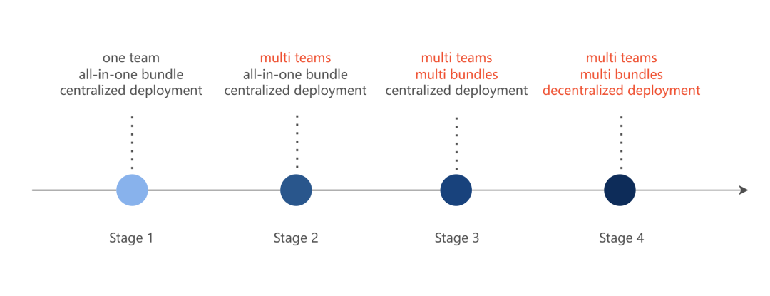 整个发展历史分为 4 个阶段,分别是单 bundle 集中开发模式、单 bundle 多业务组开发模式、多 bundle 中心化发布模式、多 bundle 去中心化发布模式。
