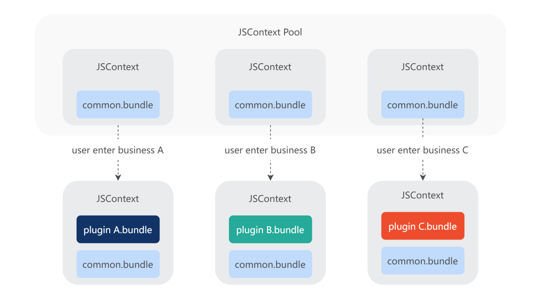 提前创建 JSContext 且预加载公共包; 进入 plugin 的页面,SDK 会查看对应的 JSContext 是否已被实例化。如果已经被实例化,就直接使用,否则从 JSContext Pool 选取一个独立的上下文,加载执行业务包,各个 plugin 之间运行时是隔离的; 退出业务页面时,该 JSContext 不会立即销毁,而是放入一个缓存池,使得重复进入该业务可以获得极致体验。