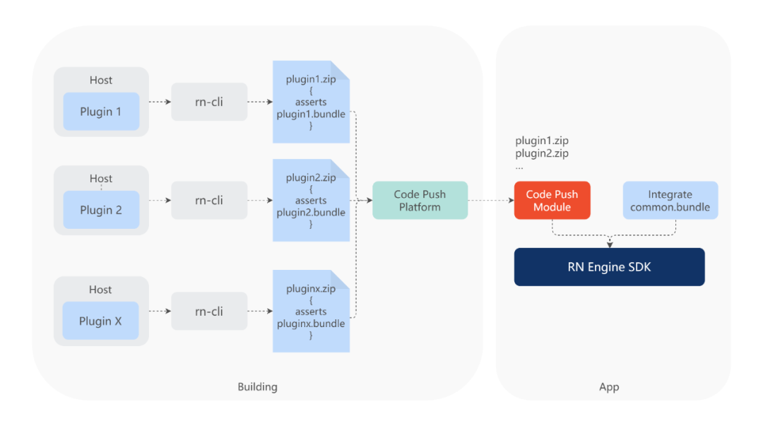 对于现有的 App,因为业务没法暂停迭代,我们难以一次性完成整体迁移。因此,我们提供了“渐进式迁移”方案。考虑到历史背景,该方案不会一次性把所有 plugin 都迁移,而是逐步拆分,再迁移接入到新发布系统。