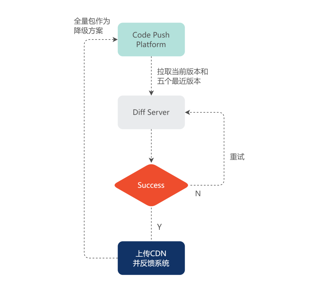 RN 资源包的 diff(差分)操作在服务端完成,patch(整合)操作在 App 端完成。在去中心化 RN 架构中,每个 plugin 的差分都是独立的。plugin 的发布会自动触发差分的执行,系统会以 plugin 为维度拉取最近五个版本,Diff Server 则会依次将它们和当前版本进行差分计算。如果计算成功,会将差分结果上传到 CDN 并反馈给系统,否则继续重试。整个差分操作是一个异步的过程,即使出现“差分服务”下线等极端情况,系统会自动降级为全量包,保证系统的可用性。