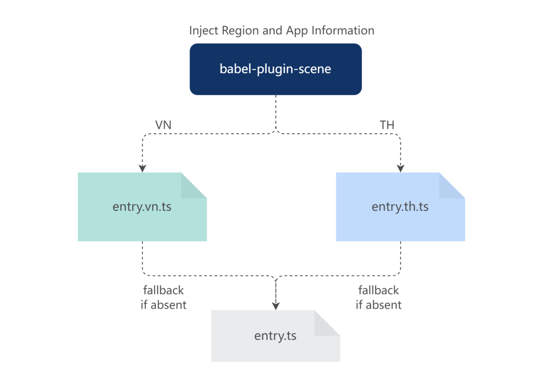 我们采用自研的多场景插件(babel-plugin-scene),该插件通过注入的环境变量设置一个场景值,babel 可以根据场景值的差异化加载不同的文件,并且以默认文件作为降级兜底。不同场景对应不同的入口文件,利用这种形式可以有效控制包体积。