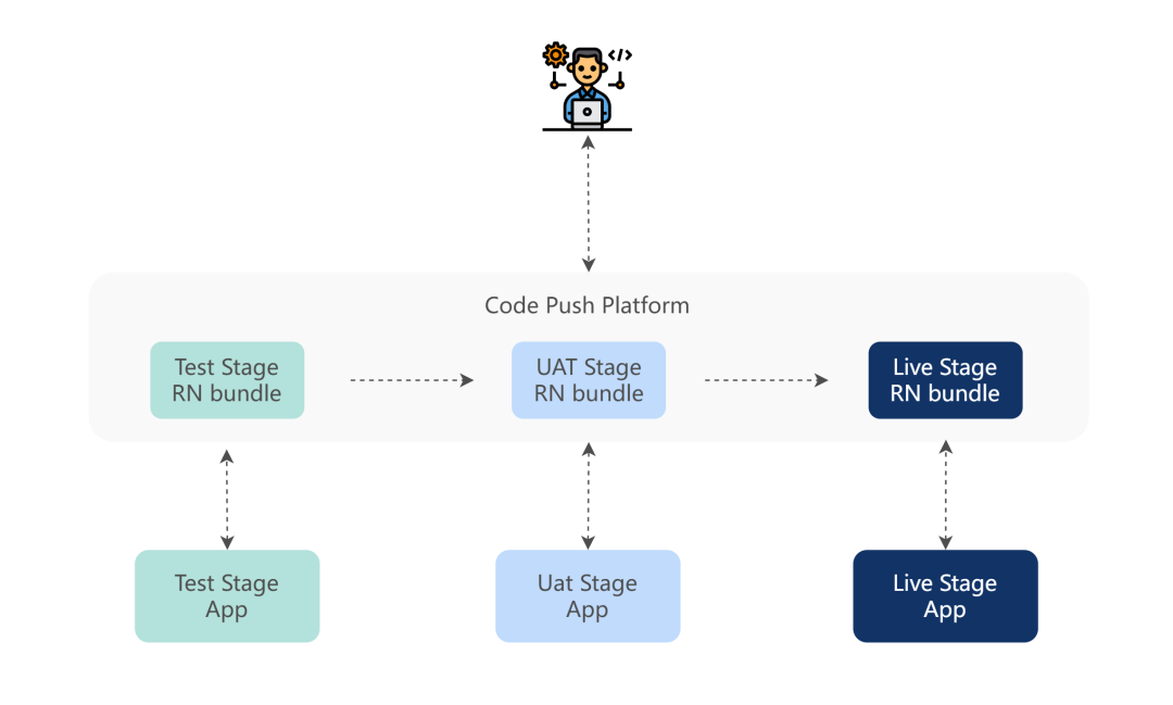 一个正常的研发流程是从 test 环境,到 uat 环境,再到 live 环境。Code Push Platform 对接了 App 的 test/uat/live 环境,所以 RN 开发者只需要在该系统就可以进行“一站式”的操作,方可满足一个需求的整个研发周期。