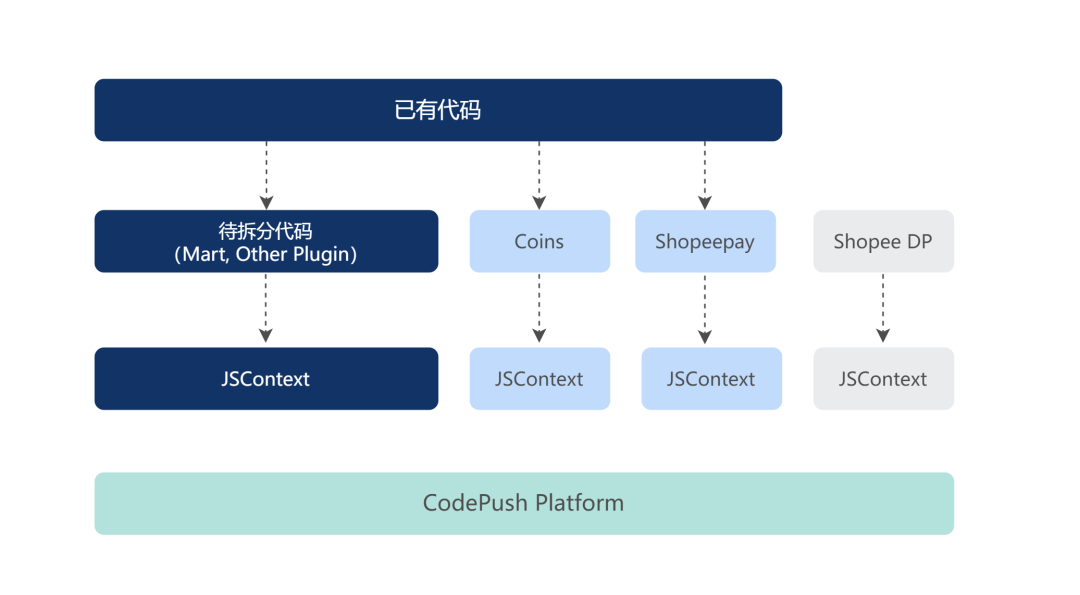 优先将独立的业务迁移到 Code Push Platform,它们享用一个独立的 JSContext; 所有“待拆分代码”共用一个独立的 JSContext; 将“待拆分代码”继续拆分成几个独立 plugin,独立使用 JSContext,其他内容则保持步骤二的状态。