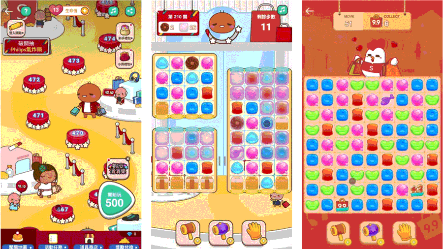 Shopee Candy 在风格上使用了缤纷可爱的糖果元素主题;玩法上主要是在限制操作步数的同时,设定收集元素数量作为通关条件。关卡内,用户通过交换相邻糖果,使三个或以上相同颜色的糖果连接起来,便可触发消除;根据消除糖果的数量和形状还可以生成有特殊消除能力的道具元素;模式上有关卡模式及无尽模式等。