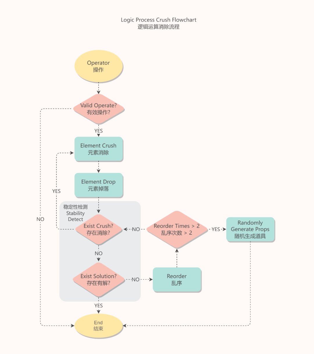 算法负责计算消除逻辑,动画系统负责播放对应动画,除了播放龙骨等特效,还会操作棋盘元素的大小、位置和显示。正常情况下动画播放结束后棋盘的状态和算法状态应该是一致的,但极少数情况下可能会由于设备性能等原因,造成时序、定时器异常等问题,进而导致两者状态不一致,比如元素不显示或位置错位等。