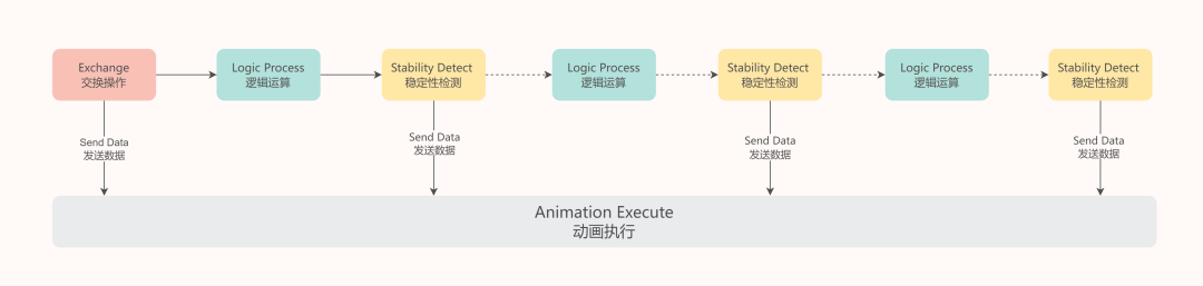 流程中元素消除多次循环时,可能会出现逻辑执行用时过长的问题,导致用户操作时丢帧。为了避免这种情况,我们将逻辑运算分成了多段,让计算异步化,提前将数据发送到动画执行,后续操作分别在不同帧中完成。