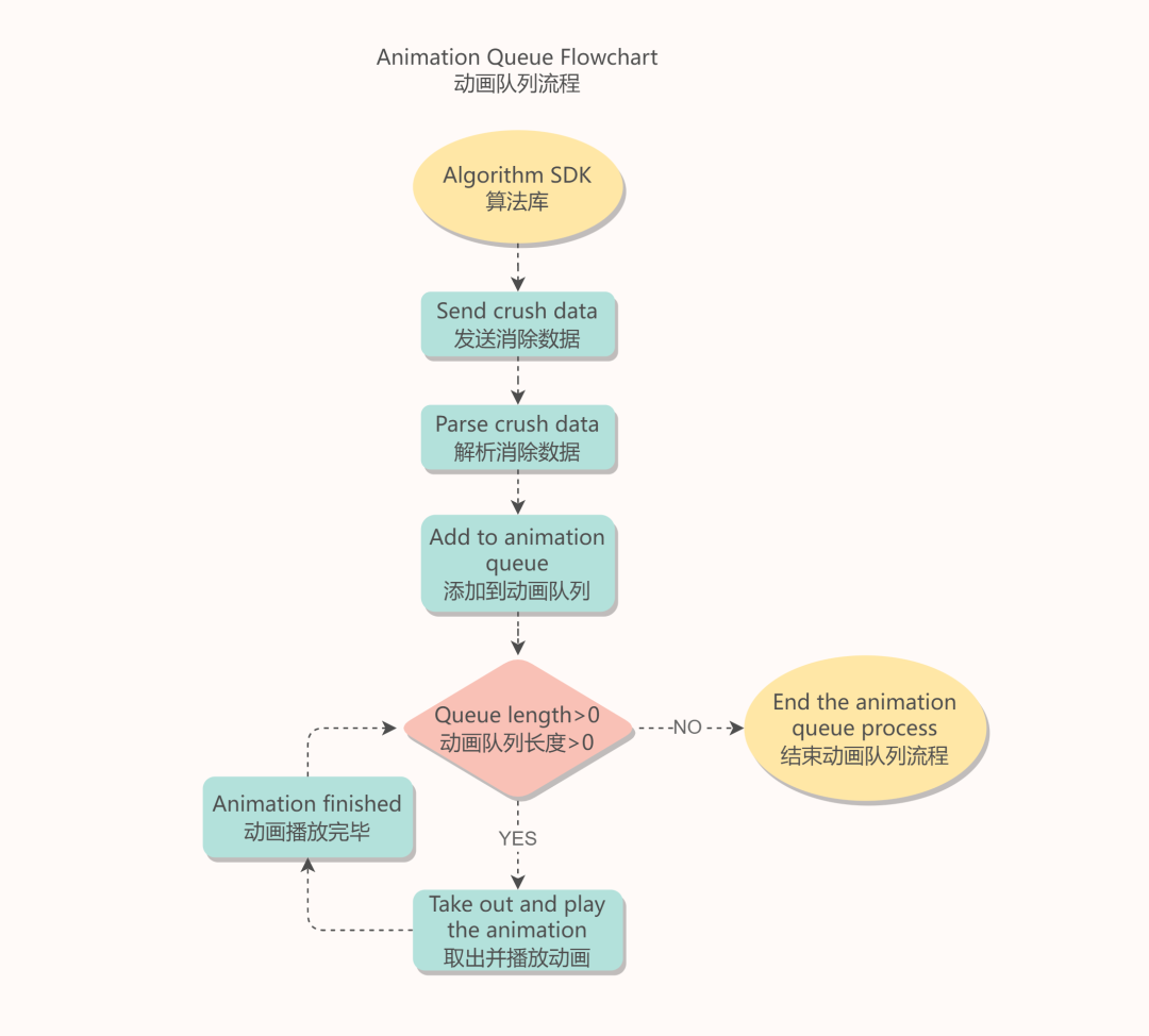 建立事件机制,算法与动画通过事件进行相互通信; 定义动画数据结构,通过定义不同的动画类型来区分动画,例如消除和下落动画,同时定义完整的动画信息,动画系统解析后播放对应动画。