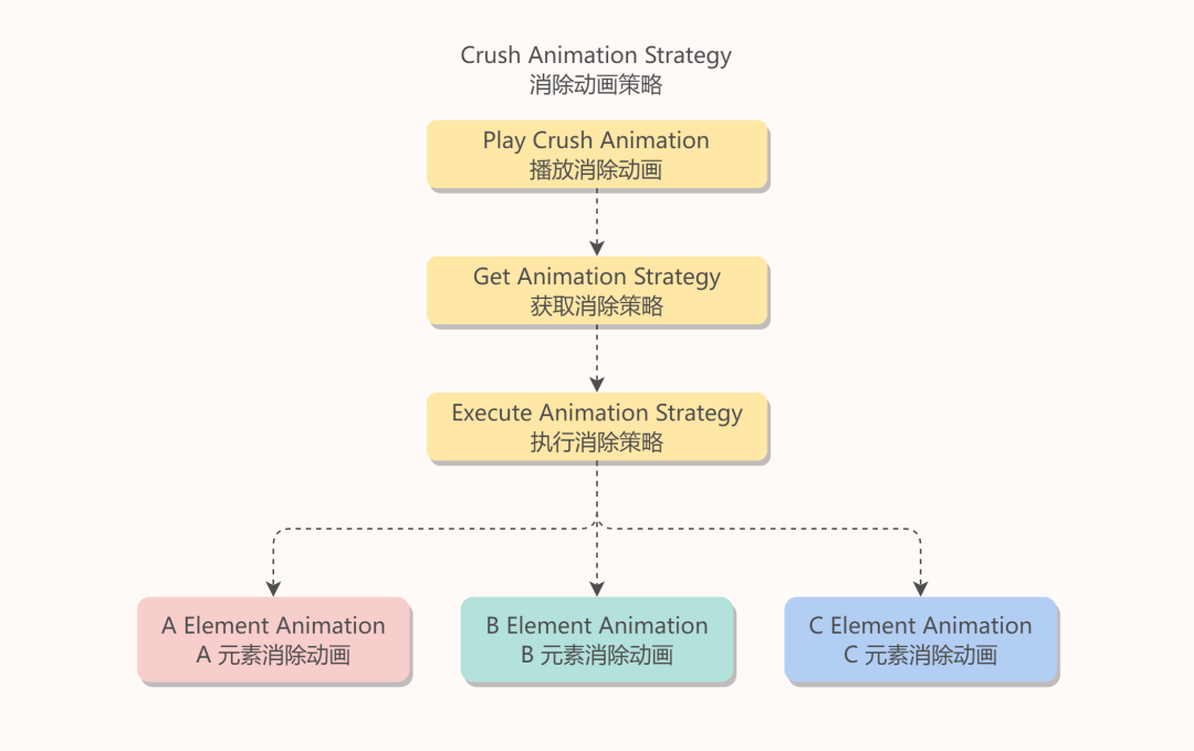 从动画队列中播放单个动画时,为了确保各个元素动画的播放彼此之间不相互影响,动画系统采用「策略模式」进行设计,根据动画类型执行不同的消除策略,将元素的动画「内聚」到各自的策略方法中。