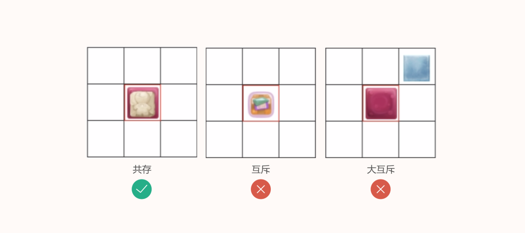 共存:A 元素和 B 元素可以同时出现在一个格子上; 互斥:A 元素和 B 元素不能同时出现在一个格子上; 大互斥:A 元素和 B 元素不能同时出现在一个棋盘上。