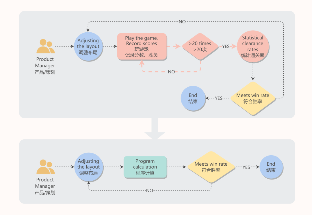 在上线前期,遇到的问题之一就是关卡策划速度追不上用户通关的速度,经常出现用户催更关卡的情况。一款三消游戏动辄几千关的设计量,对于任何团队来说都是研发工作中的一个巨大难点。其中,策划关卡最头疼和耗时是关卡的难度测试和调整,每一次调整都要人工重复试玩多次,然后统计通关率。Score Runner 正是一个可以解决图中红色枯燥费时流程的工具。