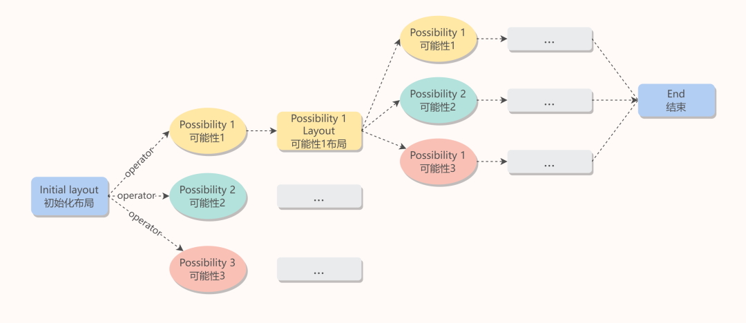 那么,下一步操作呢?在这些可能性操作后面有不同的布局,就会有更多的不同的可能性。流程大致如下: