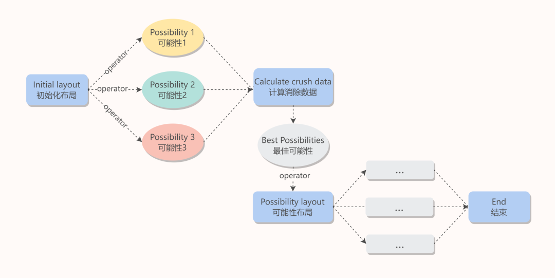 从图中可以看到,每一种可能性都能走到最后结束,但是实际上很多可能性用户是不会去操作的,比如得分少的,没有消除意义的操作等,对于通关率来说不科学,而且对于计算效率来说非常低下。