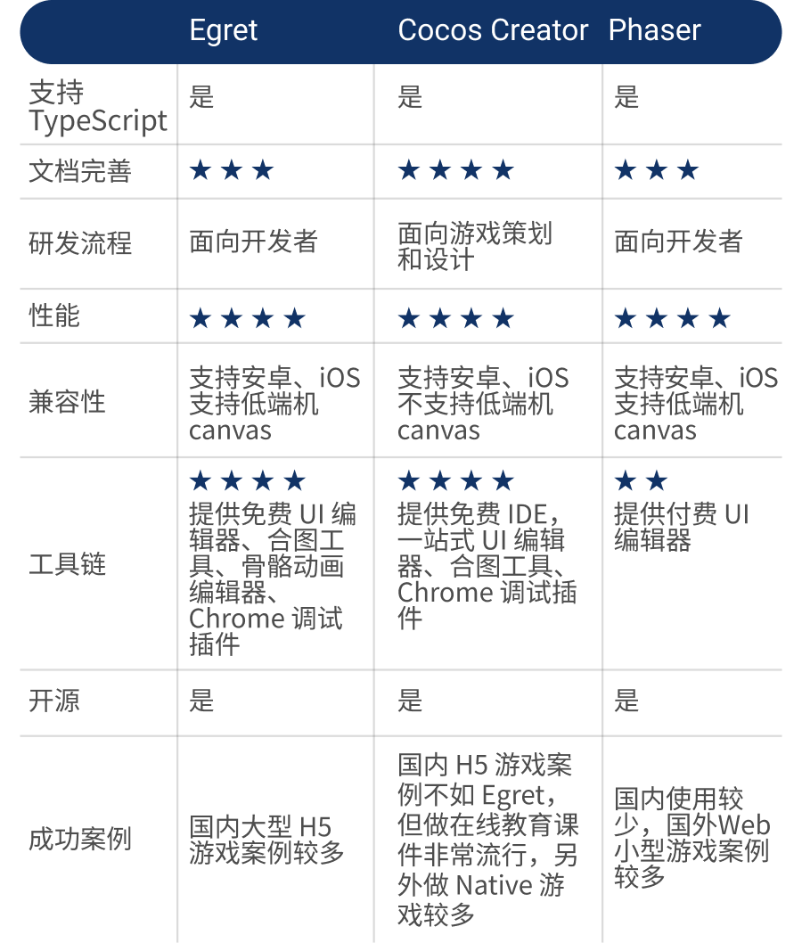 那么,最后我们重点对比 Egret、Cocos Creator 和 Phaser。Phaser 的渲染引擎就是 Pixi,后续用 Phaser 代表这两者。